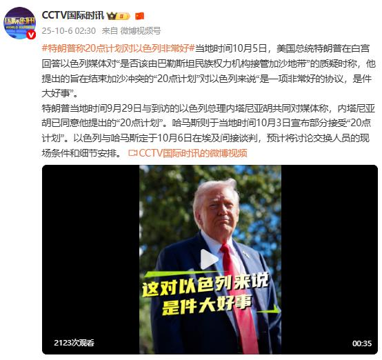 當地時間10月5日,美國總統特朗普在白宮回答以色列媒體對“是否該由巴勒斯坦民族權力機構接管加沙地帶”的質疑時稱,他提出的旨在結束加沙衝突的“20點計劃”對以色列來說“是一項非常好的協議,是件大好事”。特朗普當地時間9月29日與到訪的以色列總理內塔尼亞胡共同對媒體稱,內塔尼亞胡已同意他提出......