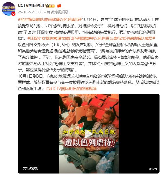 10月4日,參與“全球堅韌船隊”的活動人士在接受採訪時稱,以軍像“對待蟲子、對待恐怖分子”一樣對待他們,以軍還“狠狠折磨”了瑞典“環保少女”格蕾塔·通貝裏,“揪着她的頭髮拖行,強迫她親吻以色列國旗”。以色列外交部今天(10月5日)則發聲明稱,關於“全球堅韌船隊”活動人士通貝裏和其他參與者遭受虐......