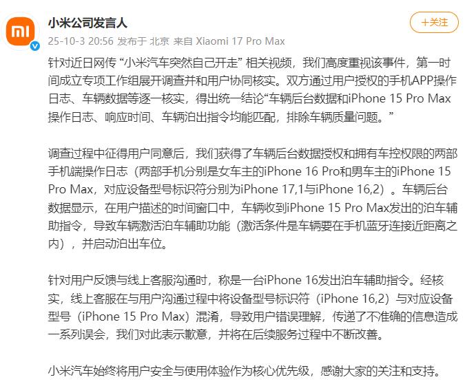 針對近日網傳“小米汽車突然自己開走”相關視頻,我們高度重視該事件,第一時間成立專項工作組展開調查並和用戶協同覈實。雙方通過用戶授權的手機APP操作日誌、車輛數據等逐一覈實,得出統一結論“車輛後臺數據和iPhone15ProMax操作日誌、響應時間、車輛泊出指令均能匹配,排除車輛質量問題。......