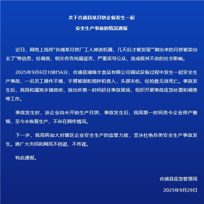 關於合浦縣某月餅企業發生一起安全生產事故的情況通報近日,網絡上流傳“合浦某月餅廠工人掉進機器,幾天後才被發現”“做出來的月餅被賣出去了”等信息,經調查,相關傳言純屬謠言,嚴重誤導公衆,造成極其不良的社會影響。2025年9月6日10時56分,合浦縣浦緣豐食品有限公司調試設備過程中發生一起安全......