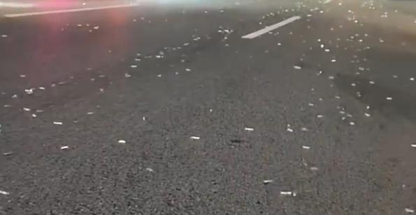 9月27日凌晨,有網友發佈視頻稱,開車行駛至廣東省東莞市石碣快速路上時,一輛大貨車一路撒落鐵釘,沿途有多輛車中招。這位駕車網友表示,“這裏撒了好多像鐵釘一樣的東西,看着很尖,像小刀一樣,撒了有十多公里,紮了多輛車的輪胎,還造成堵車。”有一位過路貨車司機稱自己的車也被扎,“是一輛貨車後尾箱側......