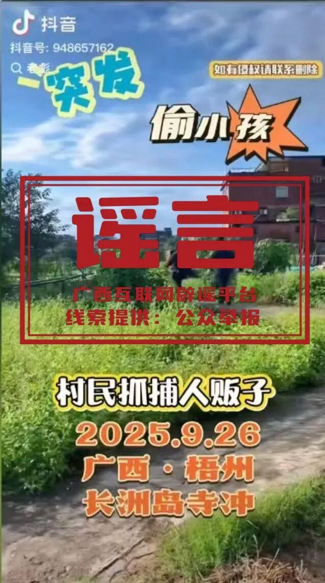 9月26日,有網民在社交媒體發佈視頻,稱長洲區長洲鎮寺衝村附近有尼姑裝扮的“人販子”出現,引起公衆關注。經覈實,網傳視頻內容不實。據長洲區長洲鎮政府和派出所民警調查瞭解,該兩人爲安徽人士作尼姑裝扮,到此地兜售物料,並非所謂的“人販子”,傳播信息與事實不符。廣西互聯網闢謠平臺提醒廣大網民:互......