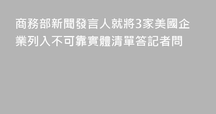 問:中方啓用“不可靠實體清單”對3家涉臺軍售企業實施制裁,請問有何考慮?答:近年來,薩羅尼克科技公司、愛爾康公司、國際海洋工程公司等3家公司不顧中方強烈反對,與臺開展所謂軍事技術合作,嚴重損害中國國家主權、安全和發展利益。中方根據《中華人民共和國對外貿易法》《中華人民共和國國家安全法》《中......