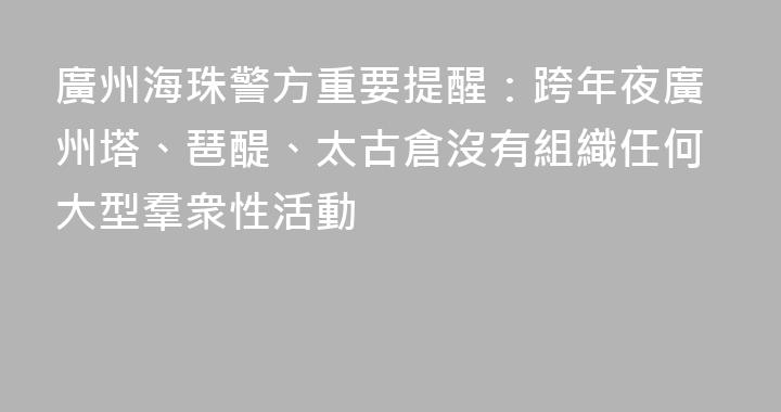 廣州海珠警方提醒市民羣衆,2025年12月31日當晚,廣州塔、琶醍、太古倉以及周邊區域等公共場所,均沒有組織迎新年倒數等任何形式的大型羣衆性活動。屆時,公安部門將視情對以上區域採取治安管控措施及臨時交通管控措施,請市民羣衆留意相關官方發佈,提前做好出行規劃。溫馨提示1、錯峯綠色出行:請儘量錯......