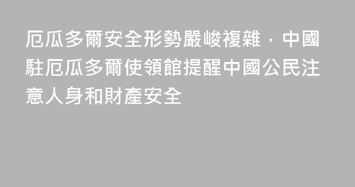 近期,中國駐厄使領館收到數起中國公民遭遇敲詐勒索、搶劫或被傷害事件報告。使領館對此高度重視,第一時間響應並提供相應領事協助,要求厄警方加大工作力度,切實保障在厄中國公民和機構安全和合法權益。當前,厄瓜多爾安全形勢嚴峻複雜。中國駐厄瓜多爾使領館提醒在厄中國公民注意人身和財產安全,增強防範意......