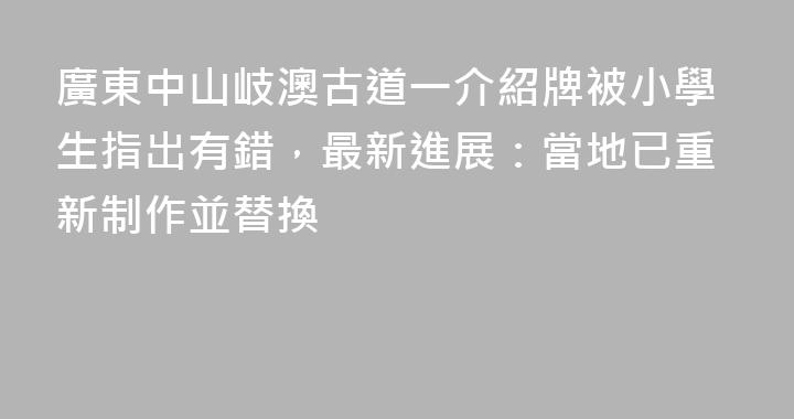 1月23日,有媒體報道,廣東省中山市岐澳古道一處介紹牌被小學生指出有錯別字,引發關注。據瞭解,1月22日有網民發視頻稱,中山市岐澳古道“郭宅稅山”界碑介紹牌被小學生指出有錯別字,將“朝廷”寫成了“朝延”。1月24日,屬地五桂山街道辦事處相關工作人員向記者介紹,他們已經重新制作了一塊介紹牌,並完成......
