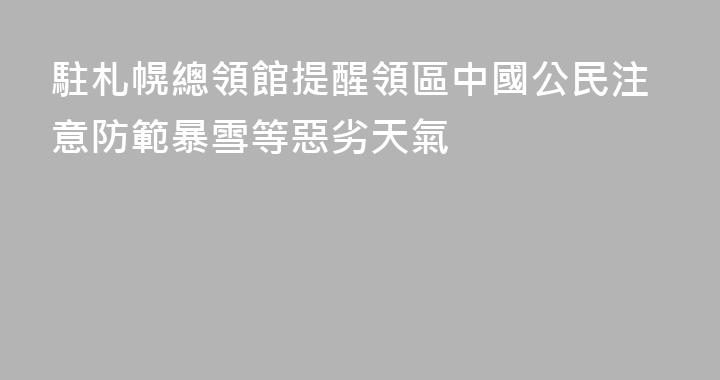 據日本氣象廳消息,未來數天日本海沿岸地區將再次出現強降雪天氣。爲切實保障人身和出行安全,中國駐札幌總領館提醒領區中國公民以及計劃來領區的中國公民注意:一、關注交通和氣象信息。惡劣天氣恐導致高速道路封閉、公共交通停運、航班延誤取消等。出行前請密切關注氣象預警和交通路況,提前安排備用方案,購......