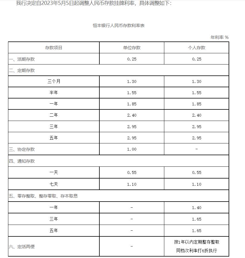 此外,恆豐銀行發佈公告,該行決定自5月5日起調整人民幣存款掛牌利率,個人存款方面,活期存款利率調整爲0.25%;三個月、半年、一年期整存整取利率分別調整爲1.3%、1.55%、1.85%;二年期、三年期、五年期整存整取利率分別調整爲2.40%、2.95%、2.95%。
