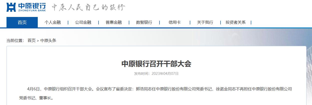 今年4月6日,中原銀行組織召開幹部大會,會議宣佈郭浩任中原銀行黨委書記,徐諾金不再擔任中原銀行黨委書記、董事長。