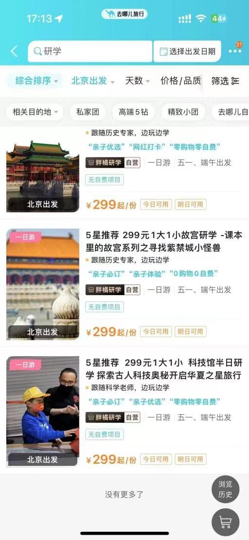 “往年研學遊預訂高峯都是在六一之後,今年相對提前了很多,很多家長從3月就開始爲孩子規劃諮詢研學產品,提前一週就開始預訂。”去哪兒相關負責人對記者說。