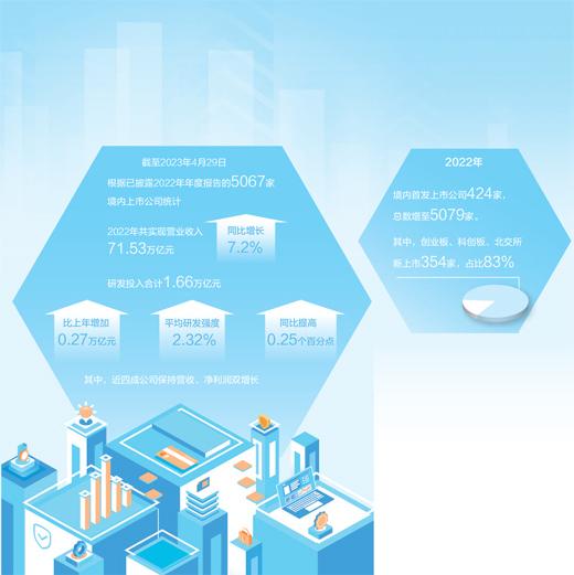 在註冊制率先落地的科創板及隨後進行註冊制試點的創業板和北交所,改革活力汩汩湧動,上市公司羣體持續壯大,引領高質量發展態勢明顯。2022年新上市公司中,創業板、科創板、北交所共計354家,佔比83%。2022年度,科創板有9家上市時未盈利企業,上市後首次實現扣非前後淨利潤均爲正值,成功“摘U”。2022年以來,深市新增上市公司226家,其中創業板新增173家,新增上市公司全年收入和淨利潤同比分別增長17.4%和3.6%,均高於深市平均水平。