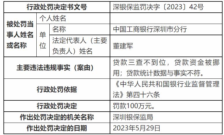 另根據深銀保監罰決字〔2023〕42號,工商銀行深圳市分行被罰款100萬元,主要涉及貸款三查不到位,貸款資金被挪用;貸款統計數據與事實不符。兩名員工分別承擔直接責任,被處以警告處罰。