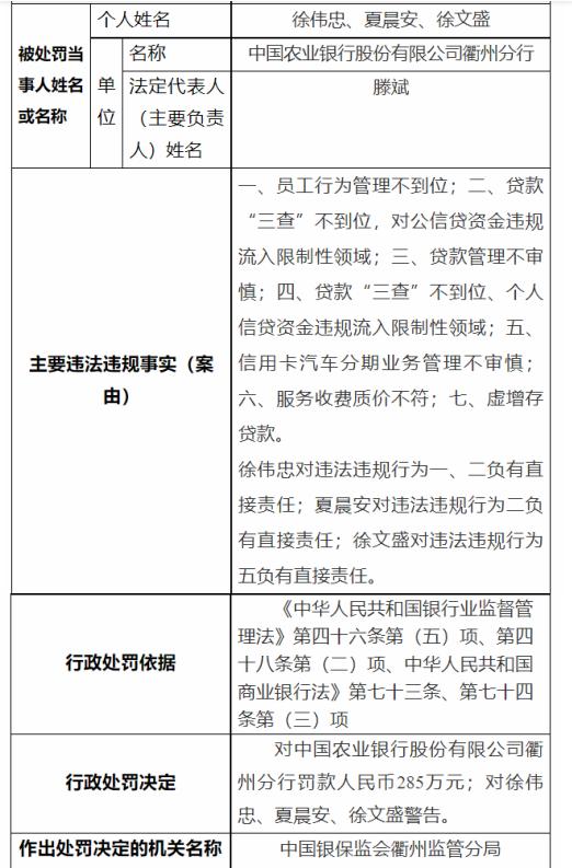 當天,銀保監會衢州監管分局披露的衢銀保監罰決字〔2023〕7號顯示,農業銀行股份有限公司衢州分行因七項違法違規被罰285萬元。具體包括,一是員工行爲管理不到位;二是貸款“三查”不到位,對公信貸資金違規流入限制性領域;三是貸款管理不審慎;四是貸款“三查”不到位、個人信貸資金違規流入限制性領域;五是信用卡汽車分期業務管理不審慎;六是服務收費質價不符;七是虛增存貸款。三名員工對違法違規行爲負有直接責任,被警告。