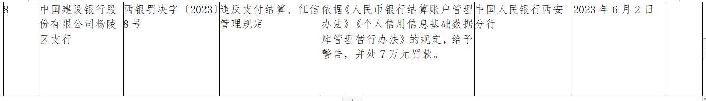 值得注意的是,在該批處罰信息中,西銀罰決字〔2023〕8號顯示,建設銀行楊陵區支行違反支付結算、徵信管理規定,中國人民銀行西安分行依據《人民幣銀行結算賬戶管理辦法》《個人信用信息基礎數據庫管理暫行辦法》的規定,給予警告,並處7萬元罰款。
