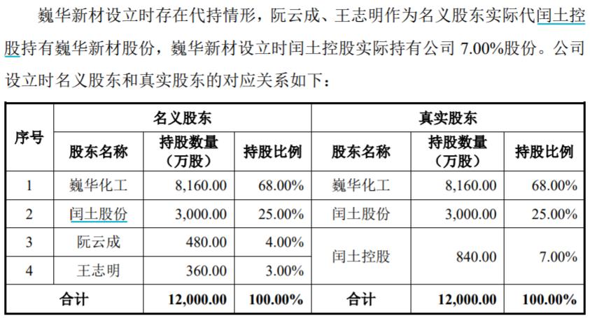 但是根據巍華新材招股書第34頁披露,巍華新材設立時存在代持情形,阮雲成、王志明作爲名義股東實際代閏土控股持有巍華新材股份,出資源於閏土控股自有資金。至於閏土股份在2013年的信息披露中是否主觀故意造假,巍華新材並未接受記者採訪。