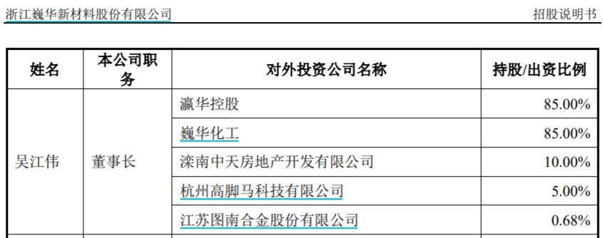 方華化學註冊資本僅爲2000萬元,由巍華新材和浙江埃森化學有限公司合資成立,分別佔59%和41%,後者爲橫店集團控股有限公司的全資子公司。從該募投項目情況來看,涉及到19億元總投資額中,確定由巍華新材投入募集資金金額就超過14億元,顯著超過了巍華新材在方華化學中不到60%的持股比例。