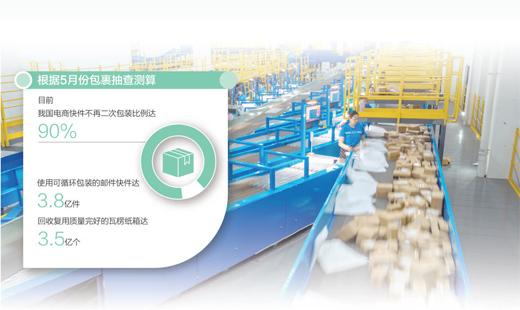 根據5月份包裹抽查測算,目前,我國電商快件不再二次包裝比例達90%,使用可循環包裝的郵件快件達3.8億件,回收複用質量完好的瓦楞紙箱達3.5億個。