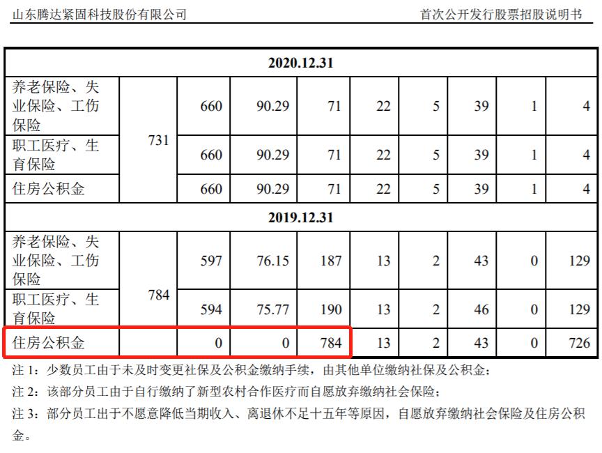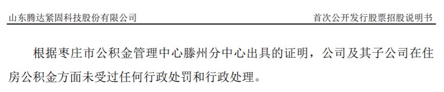 根據騰達科技最早於2022年7月發佈的招股書(申報稿),其中披露在2019年該公司的784名在職員工中,無一人繳納住房公積金。對此招股書中解釋:員工自願放棄繳納社會保險和住房公積金並不能免除發行人繳納社會保險和住房公積金的法定義務;同時多次通過宣傳教育提高其對社會保險和住房公積金的認識,並於2020年逐步規範社會保險和住房公積金的繳納。至於針對2019年及以前年度的職工住房公積金,騰達科技是否應承擔補繳義務,招股書並未做出披露,公司也未就此接受記者採訪。