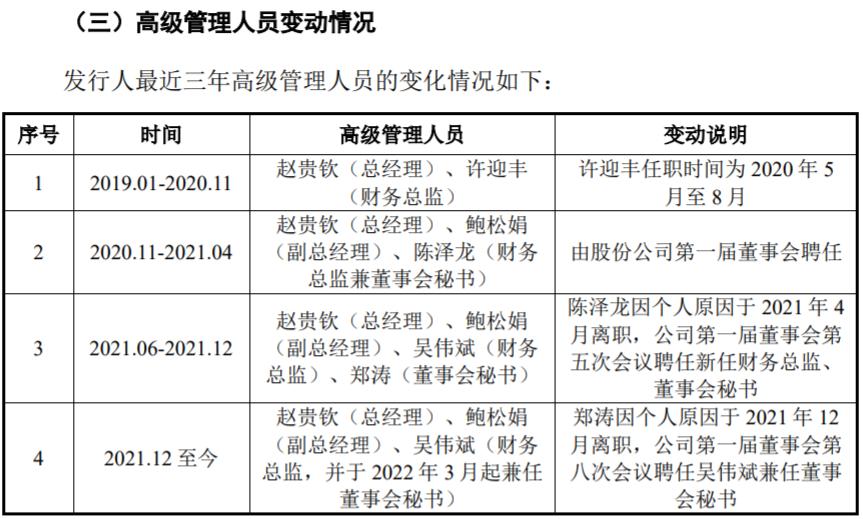 值得關注的是,公開信息披露顯示,2019年1月至2020年11月潤本股份財務總監爲許迎豐,2020年11月財務總監兼董祕變更爲陳澤龍。2021年4月陳澤龍因個人原因離職,後由吳偉斌接任財務總監、鄭濤接任董事會祕書;2021年12月鄭濤也因個人原因辭任董事會祕書,由吳偉斌兼任董祕。招股書披露,吳偉斌於2021年6月入職到潤本股份,也即在陳澤龍於2021年4月離職,至吳偉斌於2021年6月入職期間,潤本股份並無財務總監任職。至於公司核心高管人員在潤本股份申報IPO前一年內頻繁離職的原因,潤本股份並未接受記者採訪。
