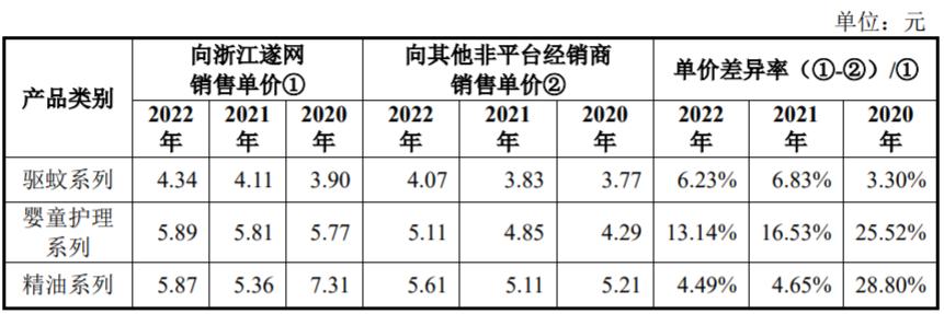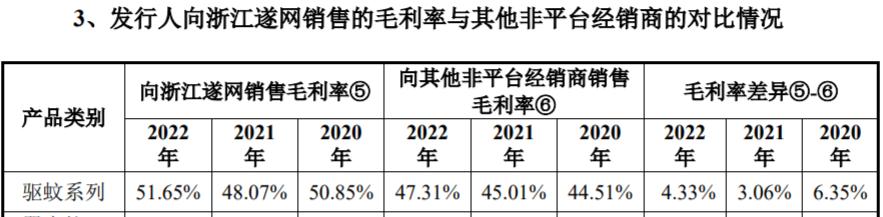 另據《發行人及保薦機構回覆意見》披露的數據顯示,作爲潤本股份拼多多和抖音旗艦店的運維公司,浙江遂網與潤本股份的產品結算金額,並未能相比其他非重要經銷商享受更高折扣,相反針對核心產品驅蚊系列產品,潤本股份對浙江遂網的銷售均價比向其他非平臺經銷商銷售均價還高出了7%,並導致潤本股份對浙江遂網的銷售毛利率,高出了其他非平臺經銷達4個百分點。