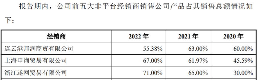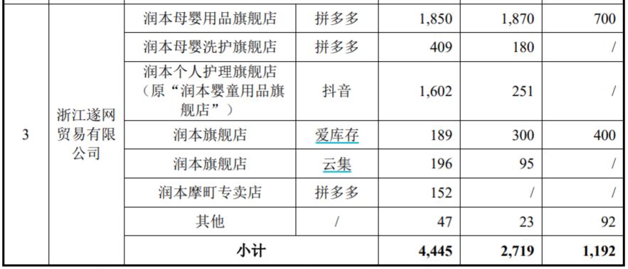 再來看潤本股份的經營信息,“浙江遂網貿易有限公司”是潤本股份的主要非平臺經銷商之一,2022年以1861.55萬元的營業收入位列潤本股份第5大客戶的位次,同年該公司銷售潤本股份產品創造的收入金額更是高達4445萬元。該經銷商主要負責運營拼多多及抖音渠道,來自於這兩個渠道的產品銷售收入也佔到該經銷商銷售金額80%以上;同時來自於經銷潤本股份產品實現的收入,也佔到該經銷商全部銷售收入的70%以上。也即該經銷商主營業務便是運營潤本股份的拼多多旗艦店和抖音旗艦店。