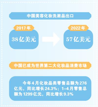 數據顯示,中國美容化妝洗漱品出口呈穩步增長態勢。海關統計表明,這一品類的出口額從2017年的38億美元躍升至2022年的57億美元,5年複合增長率8.3%。2022年,中國化妝品類商品貿易逆差爲166.7億美元,較2021年減少14.3%,化妝品類商品進口總額達223.9億美元,同比下降10.2%;出口總額達57.2億美元,同比增長17.8%。