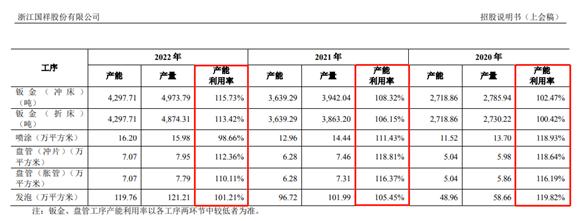 國祥股份招股書還披露,2020年、2021年,公司產能利用率超100%,2022年公司主要工序除噴塗工序外,產能利用率均超100%,四項主要工序產能利用率超110%。國祥股份常年超產能生產,是否環保、安全生產等相關規定?國祥股份並未說明。