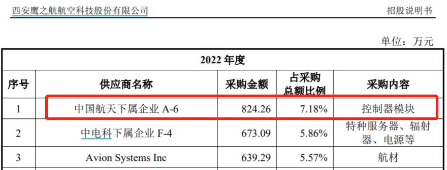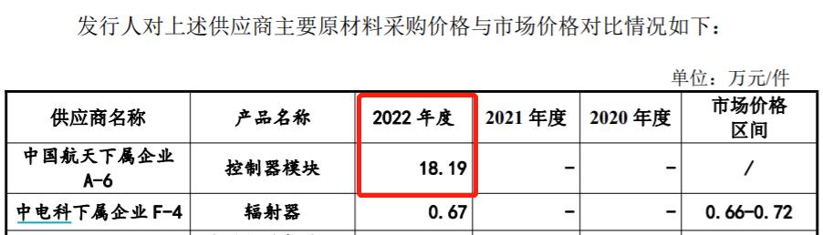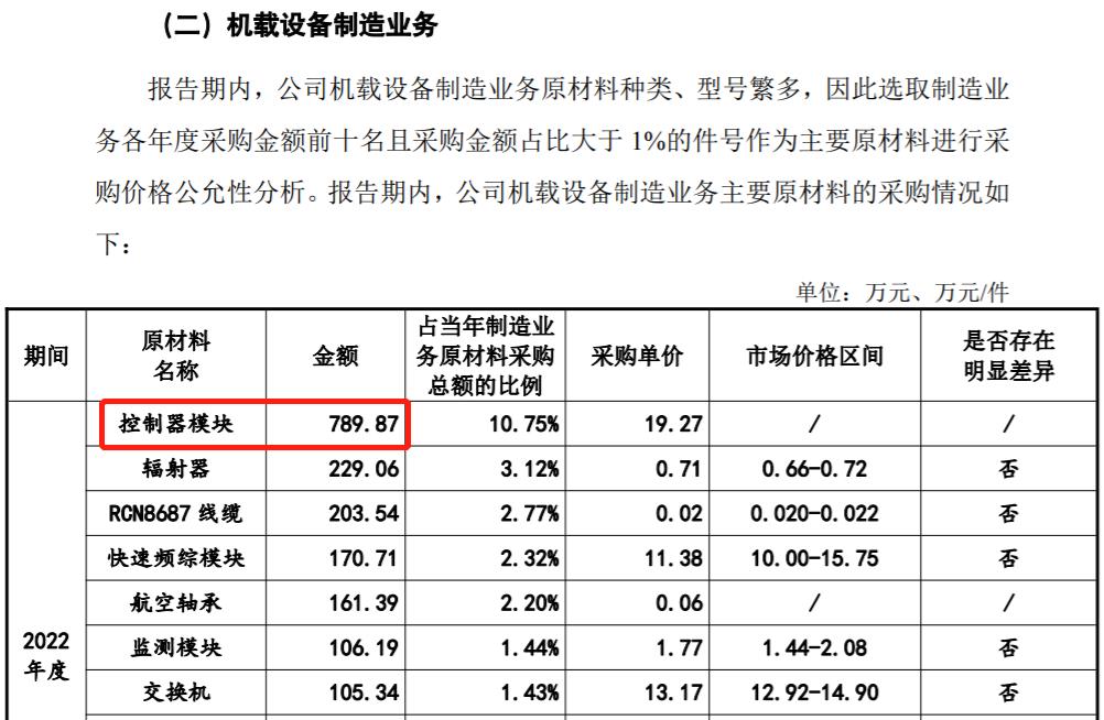 還有根據招股書披露,公司向中國航天下屬企業A-6採購控制器模塊,其中2022年採購金額爲824.26萬元。但是根據《審覈問詢函的回覆》第267頁披露的“公司機載設備製造業務主要原材料的採購情況”顯示,公司在2022年採購控制器模塊金額總共爲789.87萬元。這與招股書披露的採購金額並不相符。