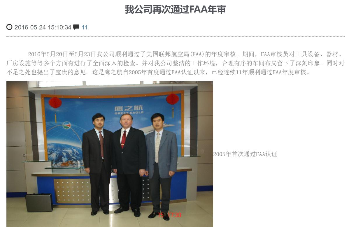 不僅如此,在鷹之航官方網站上,於2016年5月發佈了一篇題爲《我公司再次通過FAA年審》的報道,其中提到:“這是鷹之航自2005年首度通過FAA認證以來,已經連續11年順利通過FAA年度審覈。”