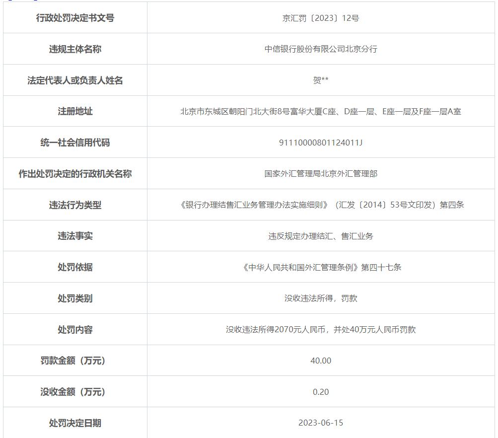此前,國家外匯管理局北京外匯管理部披露外匯行政處罰信息顯示,中信銀行北京分行因違反規定辦理結匯、售匯業務,被沒收違法所得2070元人民幣,並處40萬元罰款。