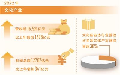 本報北京7月2日電 (記者劉志強)國家統計局日前發佈的《2022年全國文化及相關產業發展情況報告》顯示:我國文化及相關產業(以下簡稱“文化產業”)規模持續擴大,2022年營業收入超過16.5萬億元,比上年增加1698億元,增長1.0%。分行業類別看,新聞信息服務、文化消費終端生產、內容創作生產、文化投資運營、文化傳播渠道等行業營業收入比上年分別增長4.0%、2.6%、2.4%、2.0%和0.4%。