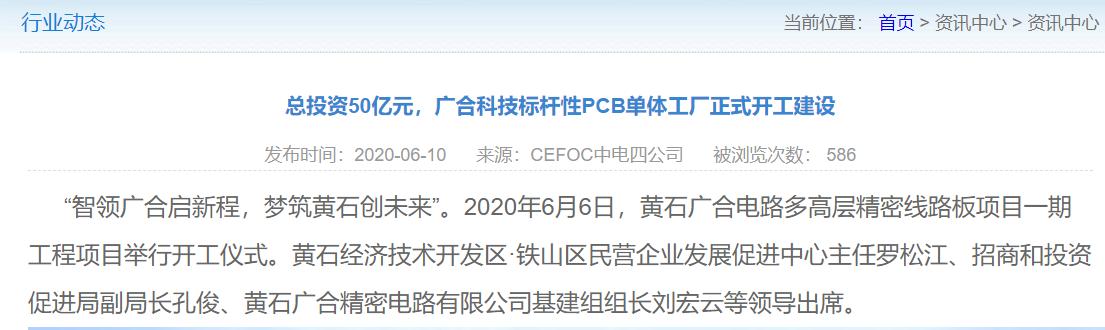 不僅如此,廣合科技的募投項目總承包方爲CEFOC中電四公司,根據該公司公開發布的《總投資50億元,廣合科技標杆性PCB單體工廠正式開工建設》報道,其中提到:項目分三期建設,一期總投資25億元,一期建設完成將實現年產360萬平方米高多層PCB生產能力,預計2021年一季度開始進入生產試運行。二,三期建設將根據市場開拓進展進行。這與廣合科技公開信息披露,及黃石經濟技術開發區鐵山區官方網站發佈內容,均存在重大差異。