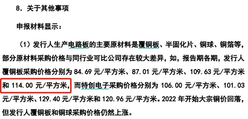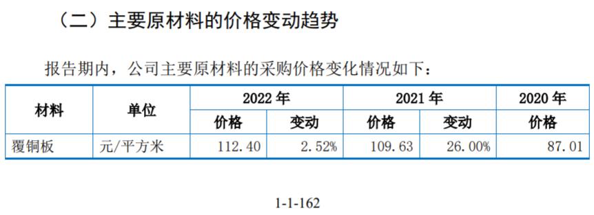 另據招股書披露,公司生產電路板的主要原材料是覆銅板,根據招股書第162頁披露的“主要原材料的價格變動趨勢”顯示,2022年覆銅板採購均價爲112.4元/平方米。但是《審覈問詢函的回覆》第151頁則披露:報告期各期,發行人覆銅板採購價格分別爲84.69 元/平方米、87.01元/平方米、109.63元/平方米和114元/平方米,其中2020年和2021年覆銅板採購均價與招股書披露一致,但是2022年採購均價卻與招股書披露的112.4元/平方米存在差異。