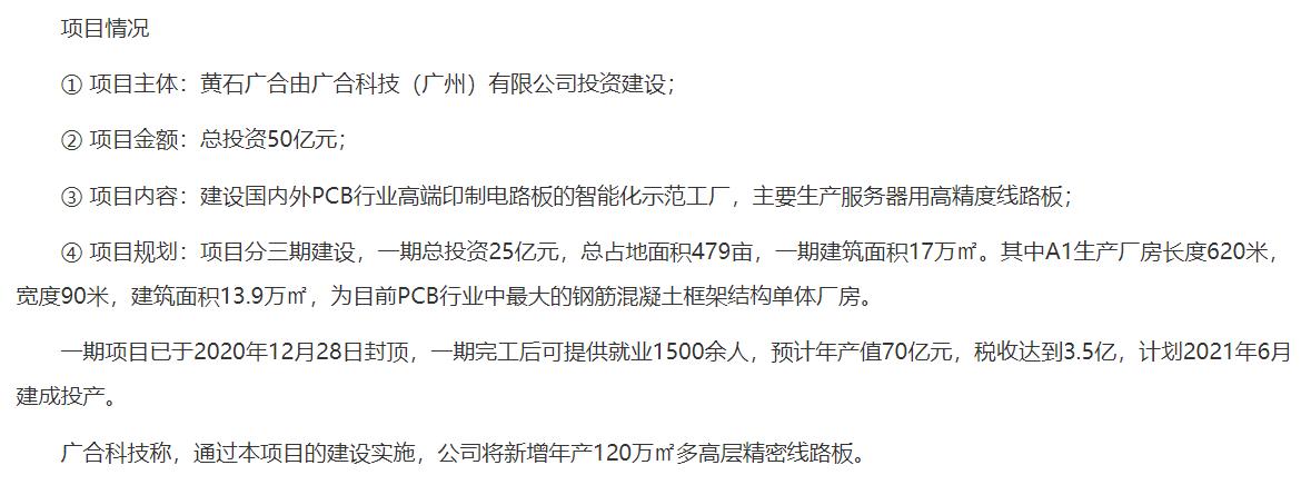 但是根據根據黃石經濟技術開發區鐵山區官方網站於2021年2月發佈的《總投資50億元的黃石廣合多高層精密線路板項目加速推進》報道:(本項目)一期項目已於2020年12月28日封頂,一期完工後可提供就業1500餘人,預計年產值70億元,稅收達到3.5億,計劃2021年6月建成投產。廣合科技稱,通過本項目的建設實施,公司將新增年產120萬㎡多高層精密線路板。