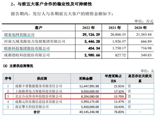 再來看合衆偉奇的經營信息,“成都思晗科技股份有限公司”是合衆偉奇2022年度第三大客戶,涉及銷售金額高達2980.66萬元。思晗科技是新三板掛牌公司,但是根據其發佈的2022年年報,該公司向合衆偉奇採購金額僅爲820.41萬元,尚不及合衆偉奇公佈的銷售金額的零頭。