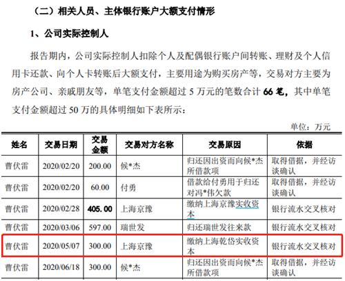 另據《審覈問詢函的回覆》第406頁披露,報告期內公司實際控制人扣除個人及配偶銀行賬戶間轉賬、理財及個人信 用卡還款、向個人卡轉賬後大額支付其中單筆
