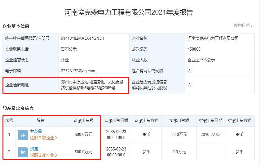 在經營了6年後,2022年4月,井友鼎、賀崑將河南埃克森股權轉讓給了付勇,2022年6月,付勇將河南埃克森註冊地由鄭州市中原區沁河路路北、文化宮路路東啟福銘都6號樓26層2605遷走,隨後的2022年11月又將河南埃克森註銷。