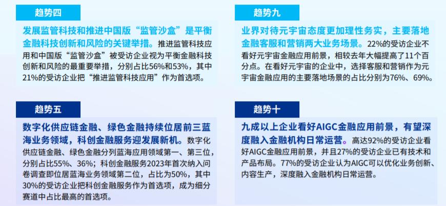 報告展望了2023年金融科技發展的十大趨勢,包括金融科技企業更加重視增強技術競爭力,降本增效趨勢較爲明顯;金融科技行業的核心痛點仍是如何在數據融合應用和安全保護間取得平衡;長三角、珠三角、京津冀等產業集羣優勢延續,蘇杭、成渝等新高地快速崛起等。