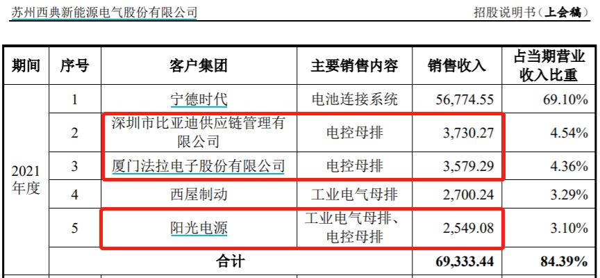 不僅如此,根據招股書披露,早在2014年公司在工業電氣母排業務穩定發展的基礎上,瞄準新能源汽車的發展機遇,正式推出用於新能源汽車領域的電控母排,併成爲比亞迪、法拉電子的供應商。直到目前,比亞迪、法拉電子仍然是西典新能電控母排的主要客戶,招股書披露2021年公司向比亞迪和法拉電子銷售電控母排金額分別爲3730.27萬元和3579.29萬元,合計爲7309.56萬元,這還沒算上同年向客戶陽光電源也銷售了部分電控母排。