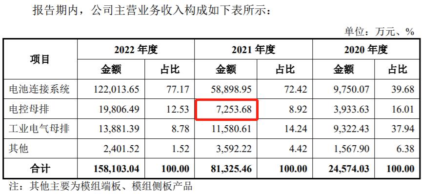 但與此同時招股書披露2021年銷售電控母排總金額僅爲7253.68萬元,尚不及詳細客戶銷售數據中,對比亞迪、法拉電子兩家客戶銷售的電控母排金額高;更不用提在《審覈問詢函的回覆》第4頁披露,公司在2021年銷售的電控母排總金額更是僅爲6053.78萬元,與招股書披露數據相差更大。