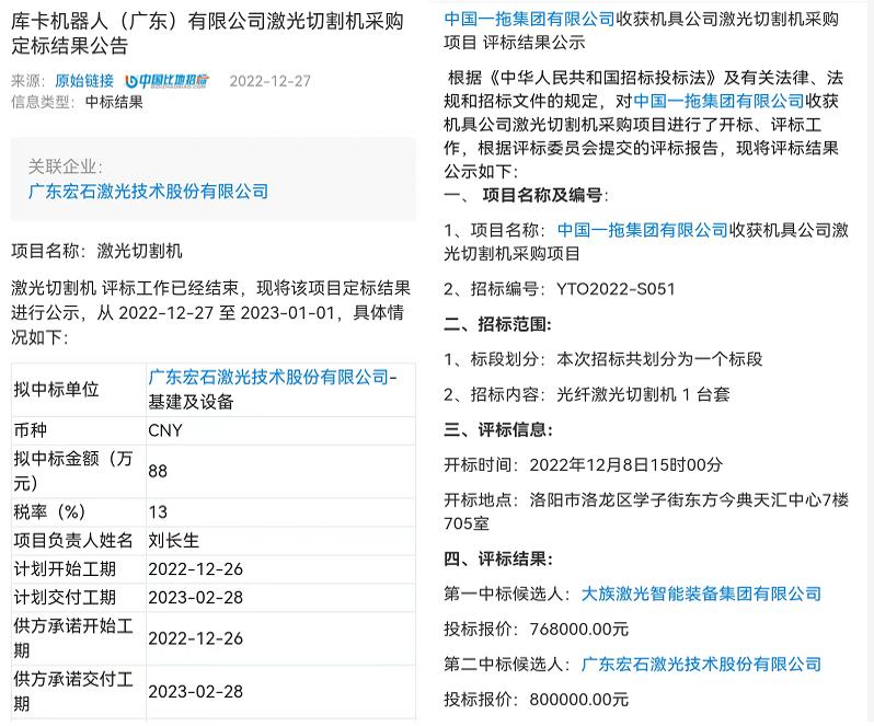 例如庫卡機器人(廣東)有限公司激光切割機採購定標結果公告顯示,宏石激光以88萬元的價格中標,還有中國一拖集團有限公司收穫機具公司激光切割機採購項目評標結果公示,宏石激光也以80萬元的價格中標光纖激光切割機1臺,這也指向公司招股書披露的銷售均價,與其他公開信息之間存在顯著差異。