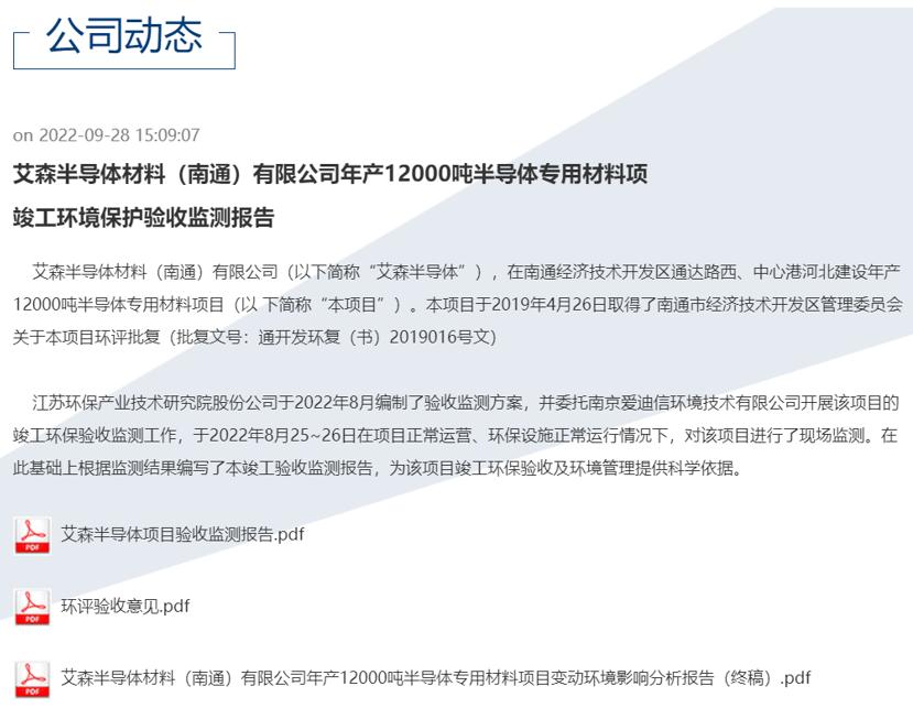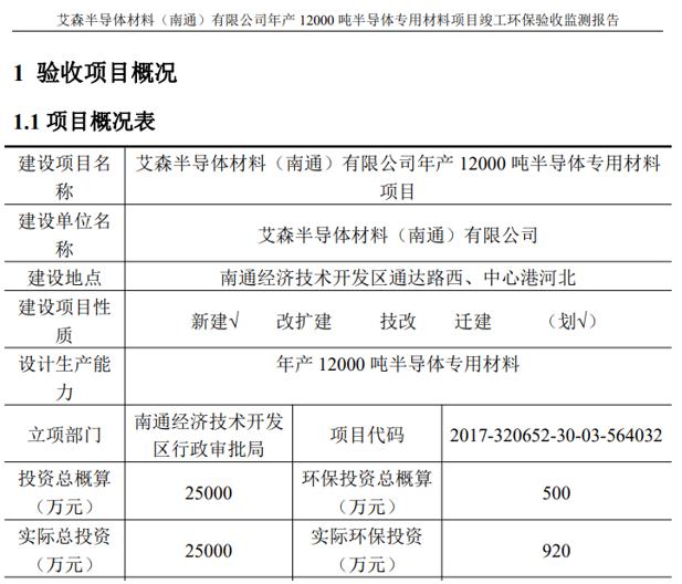 艾森股份本次上市的募投項目主要包括總投資額爲2.5億元的“年產12000噸半導體專用材料項目”,根據艾森股份官網發佈的《項竣工環境保護驗收監測報告》,該項目已於2022年8月驗收通過,實際總投資也同樣爲2.5億元。但是截止到2022年末,該項目的實施主體南通艾森總資產才僅爲1.94億元,即便考慮到累計虧損600萬元,也遠未達到2.5億元的總投資金額。