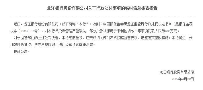 今年3月,龍江銀行曾收大額罰單。黑銀保監罰決字〔2023〕18號顯示,因多頭授信管理不力,存在多頭授信行爲;無授信或超授信額度與同業增信機構開展業務;貸後管理嚴重缺失,部分貸款被挪用於限制性領域;互聯網貸款業務侵害借款人自主選擇權和公平交易權;對增信機構違規收費行爲管控不力,導致借款人綜合融資成本過高;“兩會一層”相關履職不到位,互聯網貸款風險管理體系不健全;內部審計及內控合規檢查有效性不足等7項違規行爲,龍江銀行被罰585萬元。3月29日,龍江銀行發佈公告回應稱,已責成相關部門嚴格按照監管要求,迅速落實整改措施。