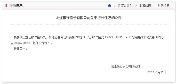 今年7月18日,姜春潔龍江銀行行長的任職資格獲監管批覆。7月31日,龍江銀行發佈了關於行長任職的公告。