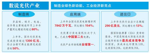 今年上半年,中國光伏產業繼續保持良好發展態勢。從製造端看,多晶硅、硅片、電池、組件等主要製造環節上半年產量同比增速均超過60%;從應用端看,上半年全國光伏發電新增併網7842萬千瓦,同比增長154%;從進出口看,上半年光伏行業出口總額超290億美元,同比增長約13%。作爲中國製造業綠色新動能,光伏產業已成爲中國工業經濟一大亮點。