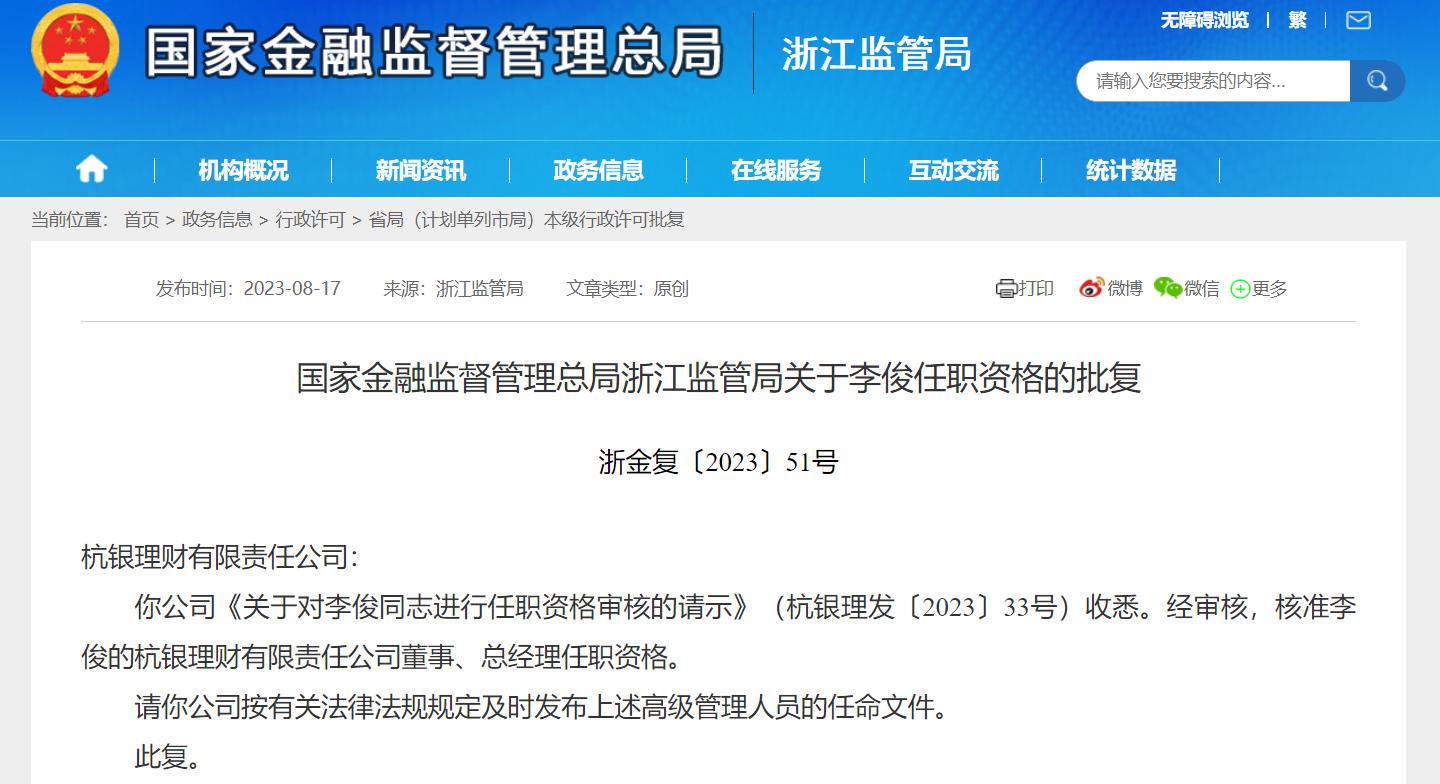 【環球網財經訊】日前,國家金融監督管理總局浙江監管局披露信息顯示,杭銀理財董事、總經理李俊任職資格獲覈准。