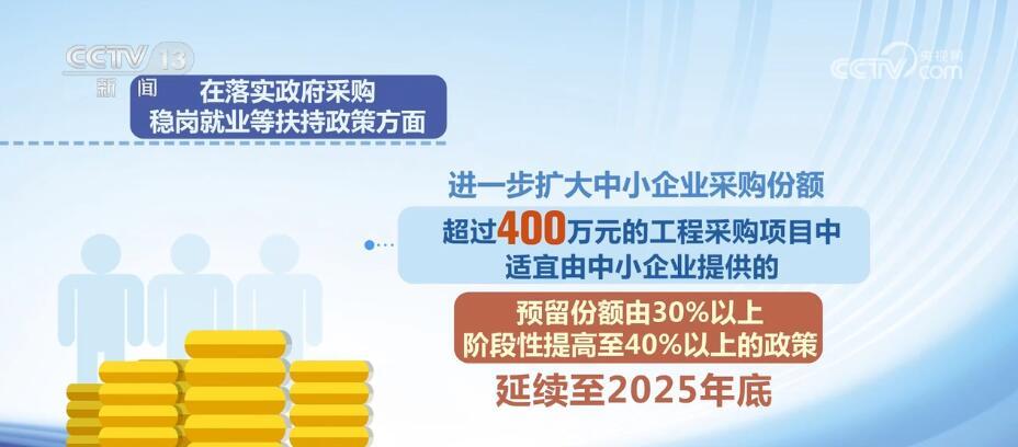 在落實政府採購、穩崗就業等扶持政策方面,進一步擴大中小企業採購份額,超過400萬元的工程採購項目中適宜由中小企業提供的,預留份額由30%以上階段性提高至40%以上的政策延續至2025年底;中小微企業招用符合條件的畢業年度或離校2年內未就業高校畢業生、登記失業青年,簽訂1年以上勞動合同的,可按規定申請一次性吸納就業補貼;符合條件的中小微企業可按不超過企業及其職工上年度實際繳納失業保險費的60%申請失業保險穩崗返還;對招用畢業年度和離校2年內未就業高校畢業生的小微企業,按規定落實社會保險補貼政策。