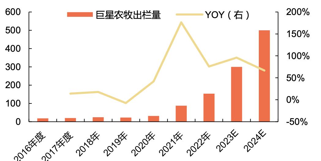 2021年、2022年,巨星農牧生豬出欄量分別爲87.1萬頭和153.01萬頭,同比分別增長308.9%和75.7%。根據巨星農牧規劃,2023-2024年生豬計劃出欄量分別爲300萬頭、500萬頭,並計劃在未來3到4年實現年出欄1000萬頭的中長期目標。