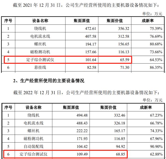 不僅如此,定子綜合測試儀是安乃達主要機器設備之一,根據公司在2022年6月發佈的第一版招股書披露,截止到2021年末擁有定子綜合測試儀賬面原值爲101.64萬元、淨值爲65.59萬元;而根據最新版招股書披露,2022年末擁有定子綜合測試儀賬面原值爲109.49萬元、較2021年末增加了8萬元左右,淨值爲68.85萬元、較2021年末增加了3萬元以上,由此計算公司針對定子綜合測試儀在2022年內計提的折舊金額僅爲5萬元,對應折舊計提低至5%。在公司針對機器設備固定資產計提折舊年限統一爲10年的背景下,上述折舊計提並不符合財務覈算標準。