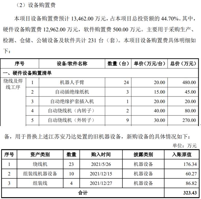 但是本次募投項目計劃總投資額高達30118.26萬元,其中包含的設備購置費預計13462萬元,遠超過公司現有產能對應的機器設備類固定資產尚不足兩千萬元的原值。以繞線機設備爲例,募投項目計劃採購的自動繞線機單價高達30至40萬元/臺,而根據《審覈問詢函的回覆》披露,公司此前在2021年5月採購的23臺新型雙頭繞線機,單價僅爲7萬元左右,遠低於本次募投項目計劃採購繞線機的價格。